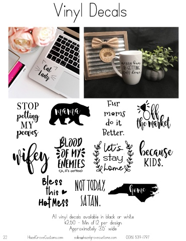 Vinyl Decals All vinyl decals available in black or white $2.50 - Min of 12 per design Approximately 3.5" wide 22 HazelGroveCustoms.com sales@hazelgrovecustoms.com (336) 539-1797